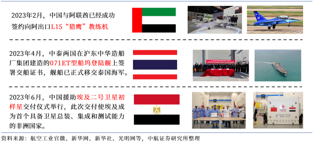 经过几十年的参加,我国的军工行业已基本具备“内轮回”的时期基础和物资条款。面前,海外军贸阛阓对“质好意思价优”武器装备的需求日益欢叫,这使得中国军贸在海外阛阓上的竞争上风正在束缚训诲。2023年以来,中国已与阿联酋签约出口L15训诲机,面向泰国委派舰船,挽救埃及卫星(详见下图)。