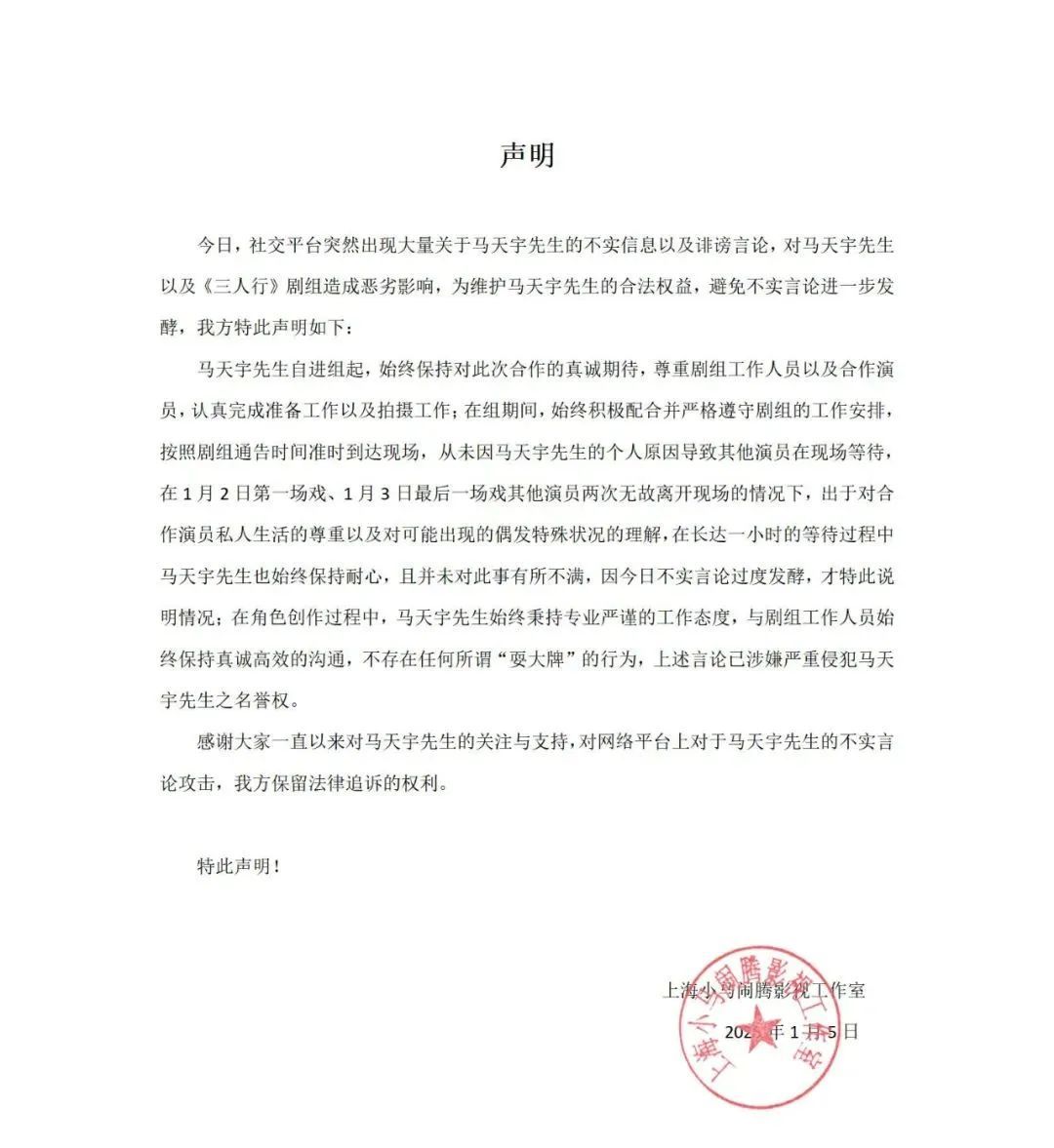 同期,马天宇使命室,发声明称,马天宇不存在所谓的“耍大牌”的举止,对会聚平台上对马天宇的作假言论过错,保握法律追诉的权益。